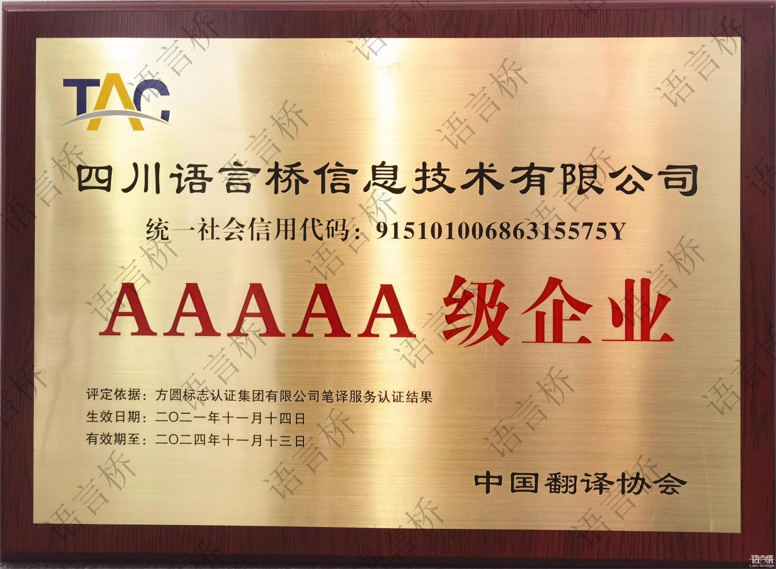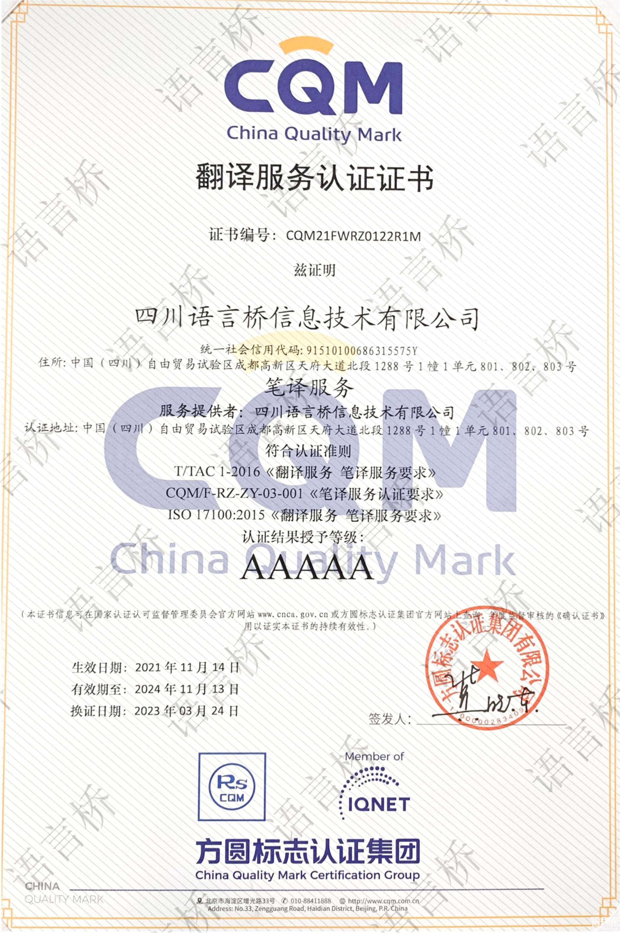 為創新推動翻譯行業標準化的建設,為創新推動翻譯行業標準化建設,中國翻譯協會依托已發布的標準、行業規范,與專業認證機構共同制定了《筆譯服務認證規范》,并由第三方認證機構方圓標志認證集團對翻譯及語言服務企業實施認證工作,通過對翻譯企業提供的筆譯服務質量管理能力和翻譯服務水平進行評價,證明翻譯企業的筆譯翻譯服務滿足國際標準ISO 17100-2015《翻譯服務 筆譯服務要求》、中國譯協標準T/TAC 1-2016《翻譯服務 筆譯服務要求》和方圓標志認證集團有限公司認證規范CQM/F-ZY-02-001《筆譯服務要求》的要求,并達到翻譯服務水平等級(A至AAAAA)。