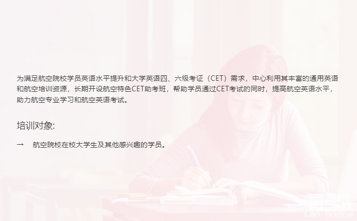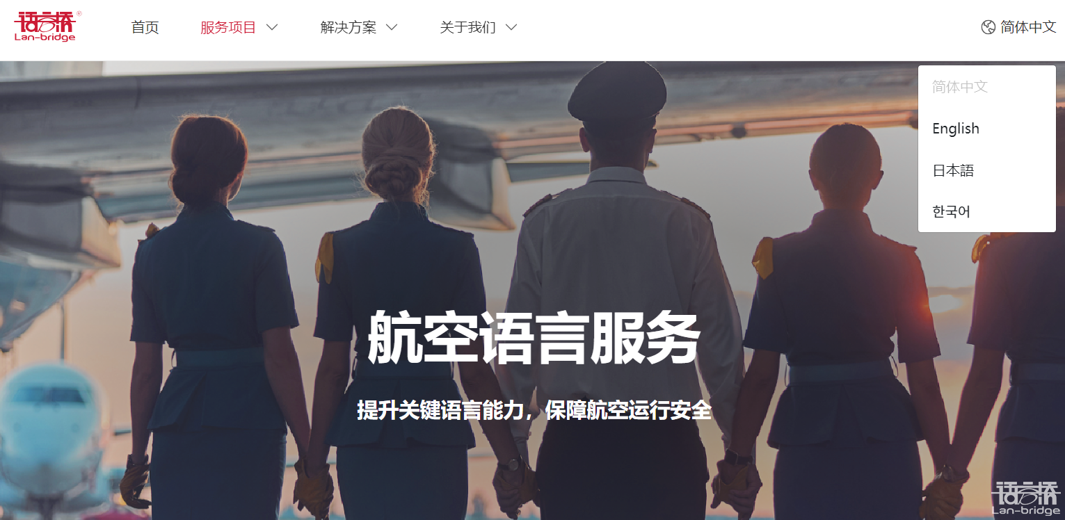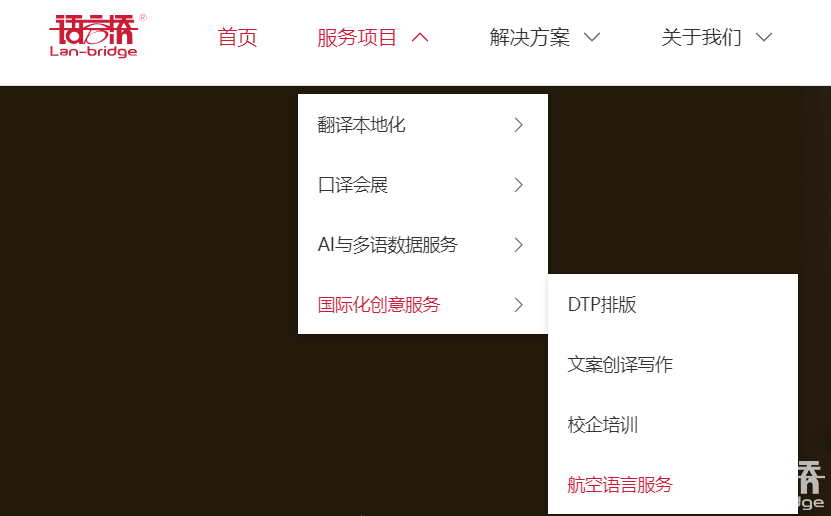 進入語言橋官網(www.lan-bridge.com)后,點擊網頁頂部菜單欄【服務項目-國際化創意服務-航空語言服務】,即可訪問頁面進行瀏覽。