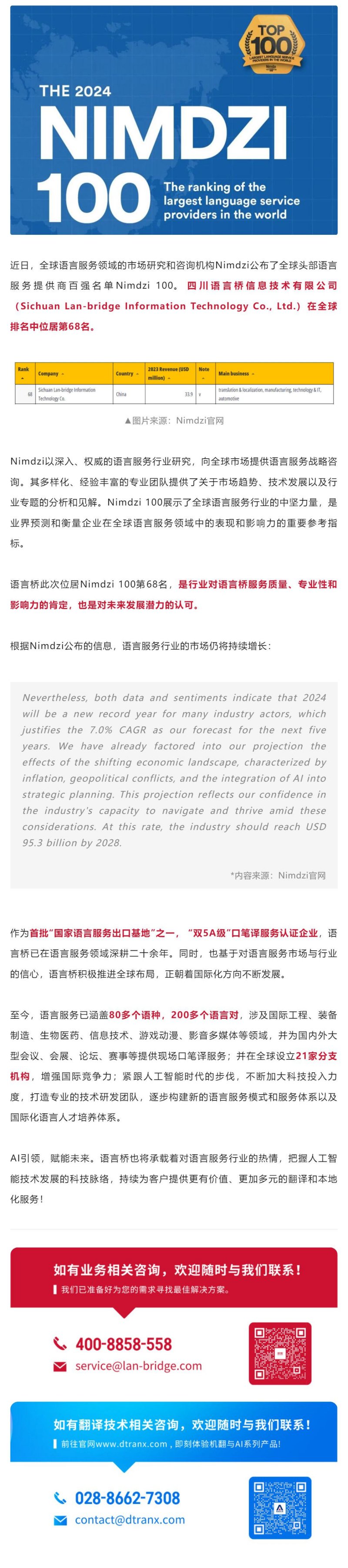語言橋位居Nimdzi全球頭部語言服務提供商排名第68名!