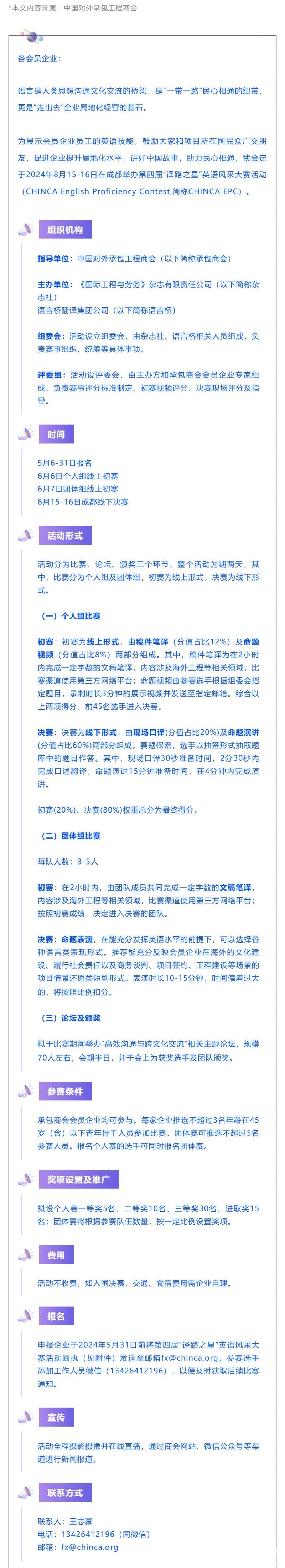 "由中國對外承包工程商會指導,《國際工程與勞務》雜志有限責任公司、語言橋翻譯集團公司主辦,第二屆“譯路之星”英語風采大賽活動(“CHINCA”English Proficiency Contest,簡稱CHINCA EPC)決"...[查看更多]