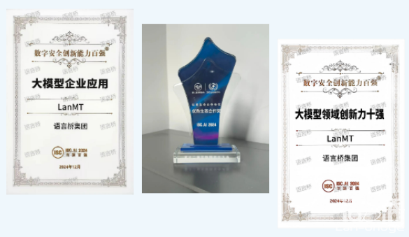 本屆創(chuàng)新百?gòu)?qiáng)由|SC平臺(tái)、大模型產(chǎn)業(yè)聯(lián)盟主辦,眾多政府單位領(lǐng)導(dǎo)、高校教育代表、行業(yè)專(zhuān)家學(xué)者、投融資機(jī)構(gòu)代表、標(biāo)桿企業(yè)代表等蒞臨現(xiàn)場(chǎng),基于數(shù)字化創(chuàng)新浪朝下的技術(shù)發(fā)展趨勢(shì)、典型成果應(yīng)用、科教融匯實(shí)踐等話題進(jìn)行深入探討,并共同見(jiàn)證了新一屆創(chuàng)新百?gòu)?qiáng)企業(yè)的震撼出爐,擎畫(huà)創(chuàng)新能力全景圖譜。語(yǔ)言橋集團(tuán)憑借自研核心產(chǎn)品LanMT Al翻譯模型(點(diǎn)擊文末"閱讀原文"體驗(yàn))在數(shù)字安全與A大模型兩大領(lǐng)域13大熱點(diǎn)賽道的近500家獲獎(jiǎng)廠商中脫穎而出,榮獲“數(shù)字安全領(lǐng)域創(chuàng)新力十強(qiáng)”與“A大模型領(lǐng)域創(chuàng)新力十強(qiáng)”,以及360數(shù)字安全“優(yōu)秀生態(tài)合作獎(jiǎng)”。