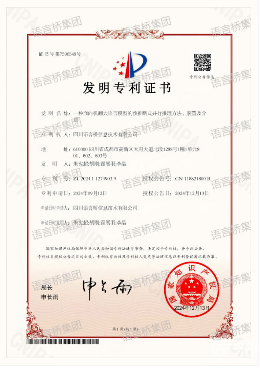 在語言的世界里,我們從未停止探索。全球化的數(shù)字時(shí)代,機(jī)器翻譯(Machine Translation,MT)已經(jīng)成為連接不同語言和文化的橋梁。隨著深度學(xué)習(xí)技術(shù)的迅猛發(fā)展,大語言模型在多語言處理任務(wù)中取得了顯著的進(jìn)展。然而,面對(duì)復(fù)雜多變的語言環(huán)境,如何提升模型的實(shí)時(shí)性和準(zhǔn)確性依然面臨諸多挑戰(zhàn)。本月,語言橋申請(qǐng)的發(fā)明專利“一種面向機(jī)翻大語言模型的預(yù)推斷式并行推理方法、裝置及介質(zhì)“獲得授權(quán),該專利技術(shù)由語言橋自主研發(fā),旨在通過引入預(yù)推斷token和并行翻譯流程來提升模型翻譯的效率和準(zhǔn)確性。