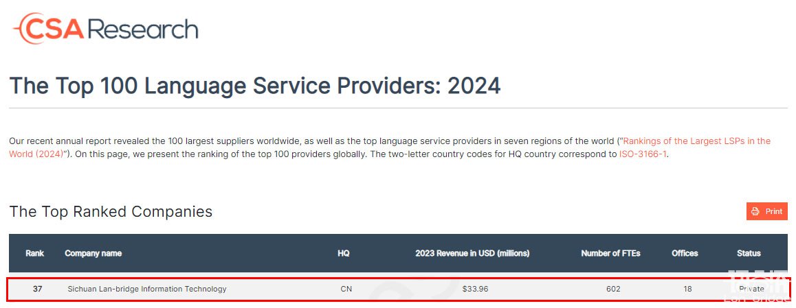 根據(jù)四川日報報道,語言橋已成功入選國家語言服務(wù)出口基地。根據(jù)CSA國際權(quán)威排行,語言橋已連續(xù)多年入選 CSA Global Top 50 語言服務(wù)供應(yīng)商。2025年,在國際權(quán)威第三方機構(gòu)——Slator發(fā)布的"The Slator 2025 Language Service Provider Index"(2025年語言服務(wù)提供商指數(shù))中語言橋位列全球翻譯服務(wù)提供商第30位。與此同時,語言橋已榮獲ISO9001:2015質(zhì)量管理體系認證、翻譯協(xié)會會員、AAAAA級筆譯服務(wù)認證、AAAAA級口譯服務(wù)認證等多項殊榮。