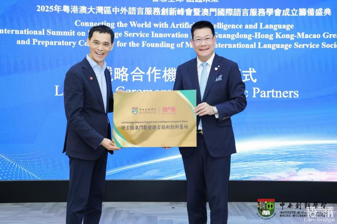 會議期間,語言橋集團與中西創(chuàng)新學院正式簽署戰(zhàn)略合作協(xié)議,標志著雙方在數(shù)智語言服務領(lǐng)域正式開啟了深度合作的新篇章。同時,憑借在語言技術(shù)與創(chuàng)新應用方面的領(lǐng)先實力,并獲授“語言橋澳門數(shù)智語言技術(shù)創(chuàng)新基地”牌匾,標志著雙方在數(shù)智語言服務領(lǐng)域開啟深度合作新篇章。