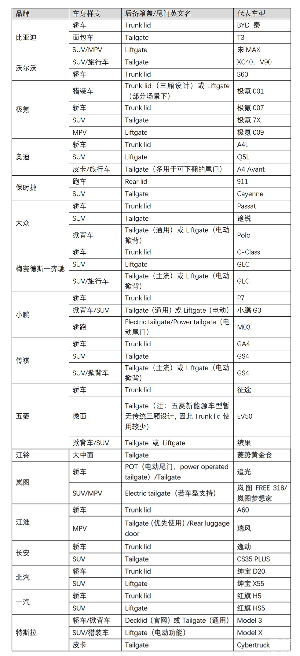 盡管筆者搜集了大量信息以確保本文的準(zhǔn)確性,但由于不同車輛的獨特性以及車企自身的命名選擇,市場上各類車輛的后備箱蓋和尾門的英文名稱并不統(tǒng)一。因此,具體名稱取決于車企及車輛的款式和型號。下表為部分車企的后備箱蓋和尾門英文名稱,可供參考(信息可能會更新):
