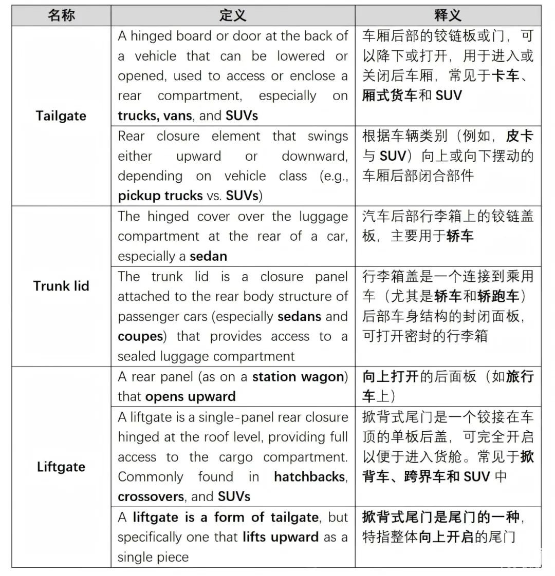 總而言之,盡管Tailgate/Liftgate與Trunk lid都表示用于保護車輛后部并提供進入存儲區(qū)域的通道的部件,但其設(shè)計和功能因車輛類型和市場標(biāo)準(zhǔn)存在顯著差異,因此在使用英文名稱時需加以區(qū)分。