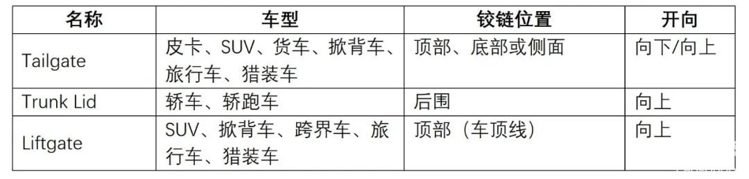 一般來說,Trunk lid,Tailgate和/或Liftgate分別適用于不同的車身類型和載貨區(qū)設(shè)計。在細分市場中,車企也會根據(jù)其車型和偏好選擇使用不同的術(shù)語。汽車行業(yè)常用以下說法來對其釋義: