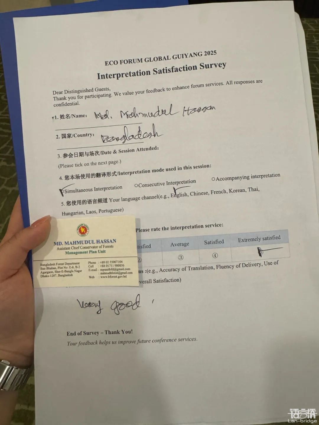 在論壇召開前,語言橋組織譯員深入學習論壇背景資料,包括貴州省生態建設政策、綠色產業發展報告等,并針對不同語種進行術語統一,確保翻譯的專業性和一致性。